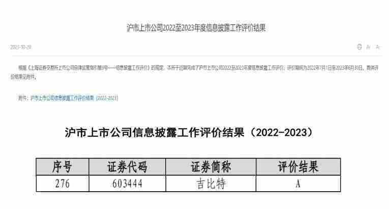 近日,,,,上海证券交易所(以下简称“上交所”)发布2022-2023年度信息披露工作评价结果。。。35273(股票代码::::603444)凭借规范的公司治理、、、高质量的信息披露以及良好的投资者关系管理再次荣获信息披露工作A级评价,,,,公司连续两年获此殊荣。。。。